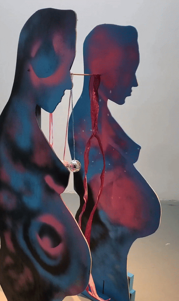 Sculpture, 4.3’ x 9.6'‘. Materials: wood, spray paint, gender reveal party cupcake wrappers, ribbon, acrylic disco balls.